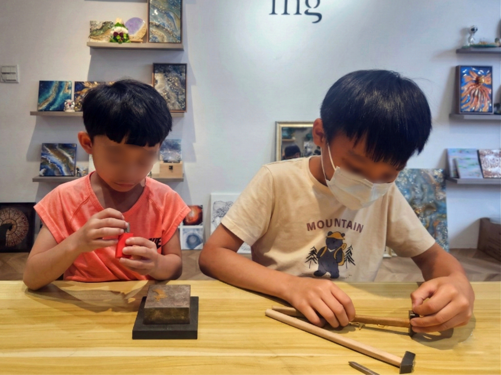 ▲孩子們化身小小金工師,老師帶領孩子體驗切割、打磨與敲字等傳統工法,將平凡的銅片淬鍊成獨一無二的鑰匙圈