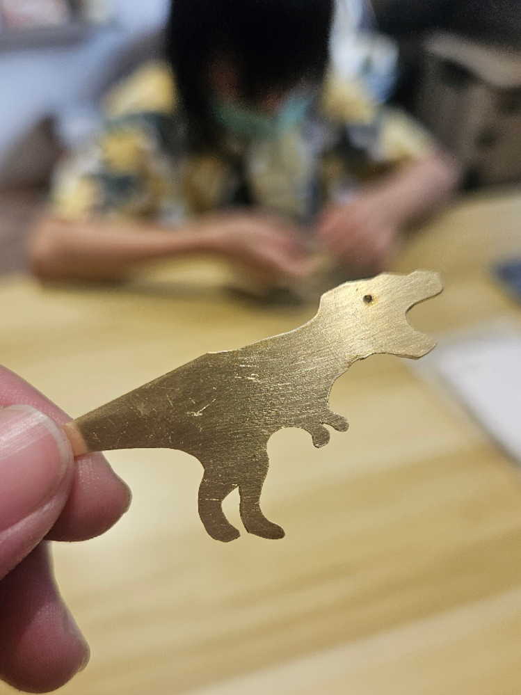當同儕多選擇貓狗造型時,院生小渝勇敢挑戰高難度的恐龍款式,克服繁複稜角完成切割的那一刻,臉上寫滿了自豪。隨後的打磨階段,教室安靜得只剩下磨銼聲,每個人都屏氣凝神,直到銅片散發光芒。最後,孩子們慎重地在作品刻下專屬記號,這份手作的溫度,成為他們心中難忘的新奇體驗。